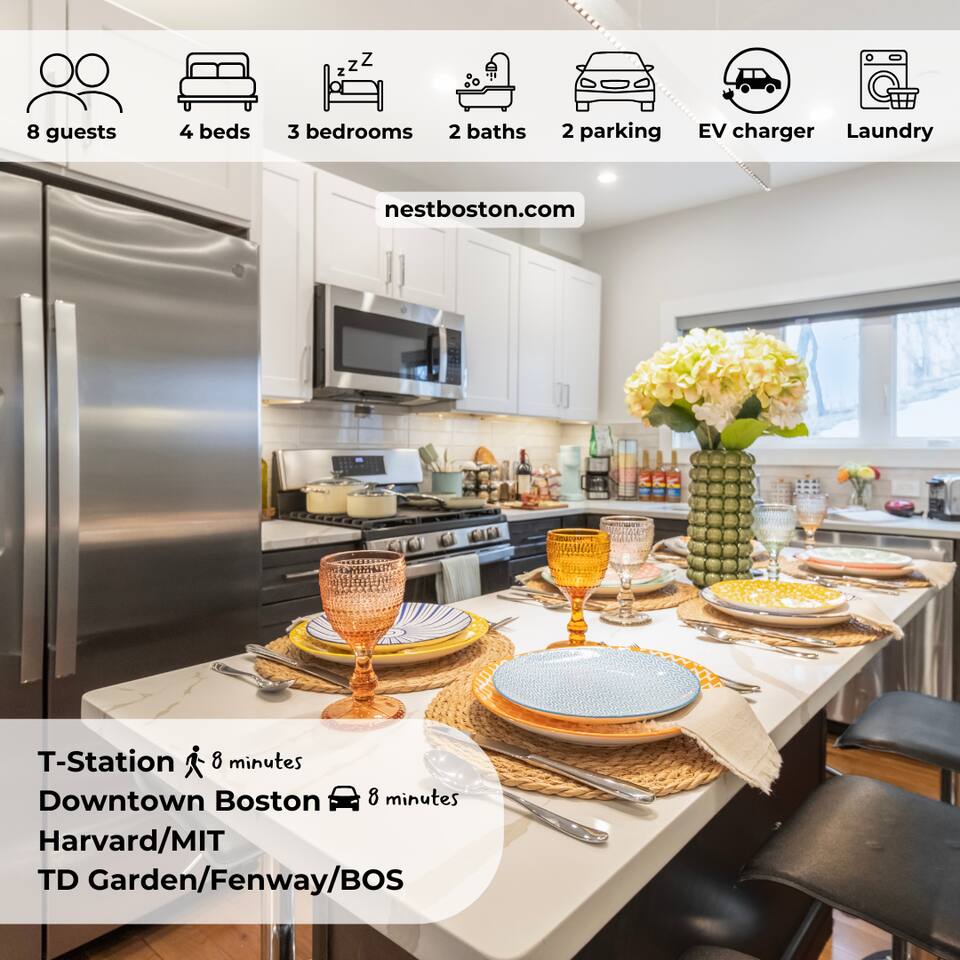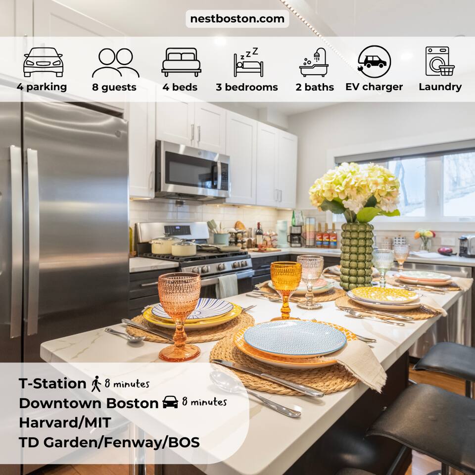 Where Boston Character Lives ✅ Free parking for 4 vehicles - EV charger - BONUS parking before сheck-in/after check-out is available ✅ 8-minute walk to the T ✅ Family, Baby & Pet friendly ✅ First-floor unit ✅ FREE luggage STORAGE in case of an early check-in/late check-out ✅ EV charger ✅ Close to Kendall Square, MIT, Harvard, TD Garden, and downtown Boston Welcome to this modern 3-bedroom home! Enjoy living spaces, parking, and a fantastic walkable location with easy access to the T-station.